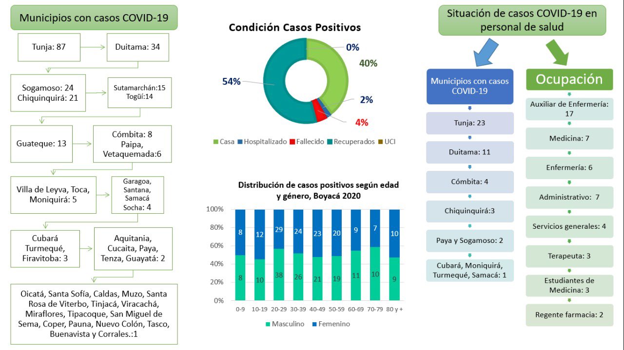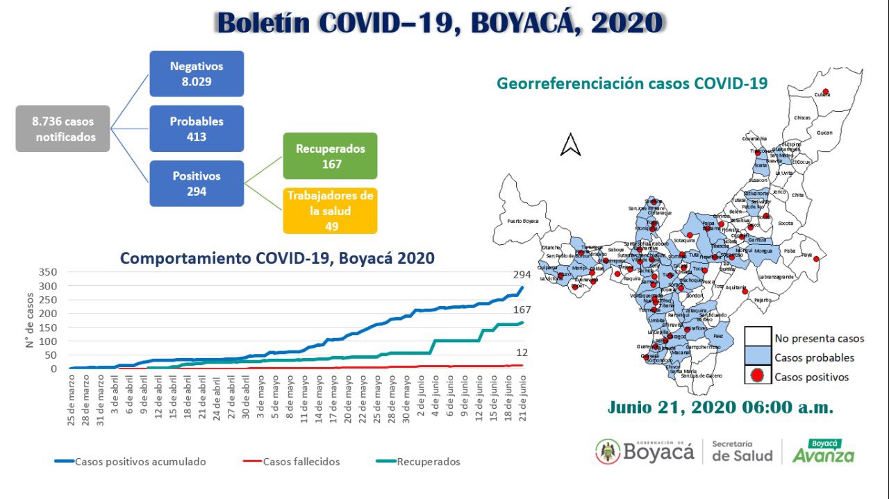 Para hoy 21 de junio, a las 6:00 a.m., equipo de Vigilancia en Salud Pública confirma 8.736 tomas de muestras, en 89 municipios de Boyacá, de las cuales:
