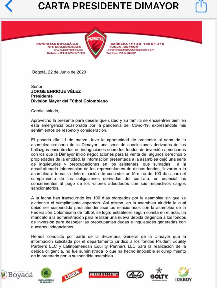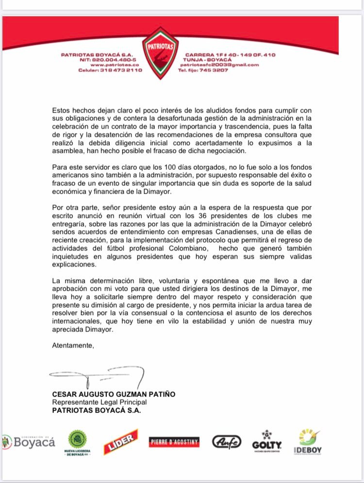 El pasado lunes 22 de junio se dio a conocer la carta emitida por parte de Cesar Guzmán presidente de Patriotas Boyacá en la que hace referencia a los incumplimientos en cuanto a las solicitudes realizadas por la asamblea de la Dimayor a su presidente Jorge Enrique Vélez.