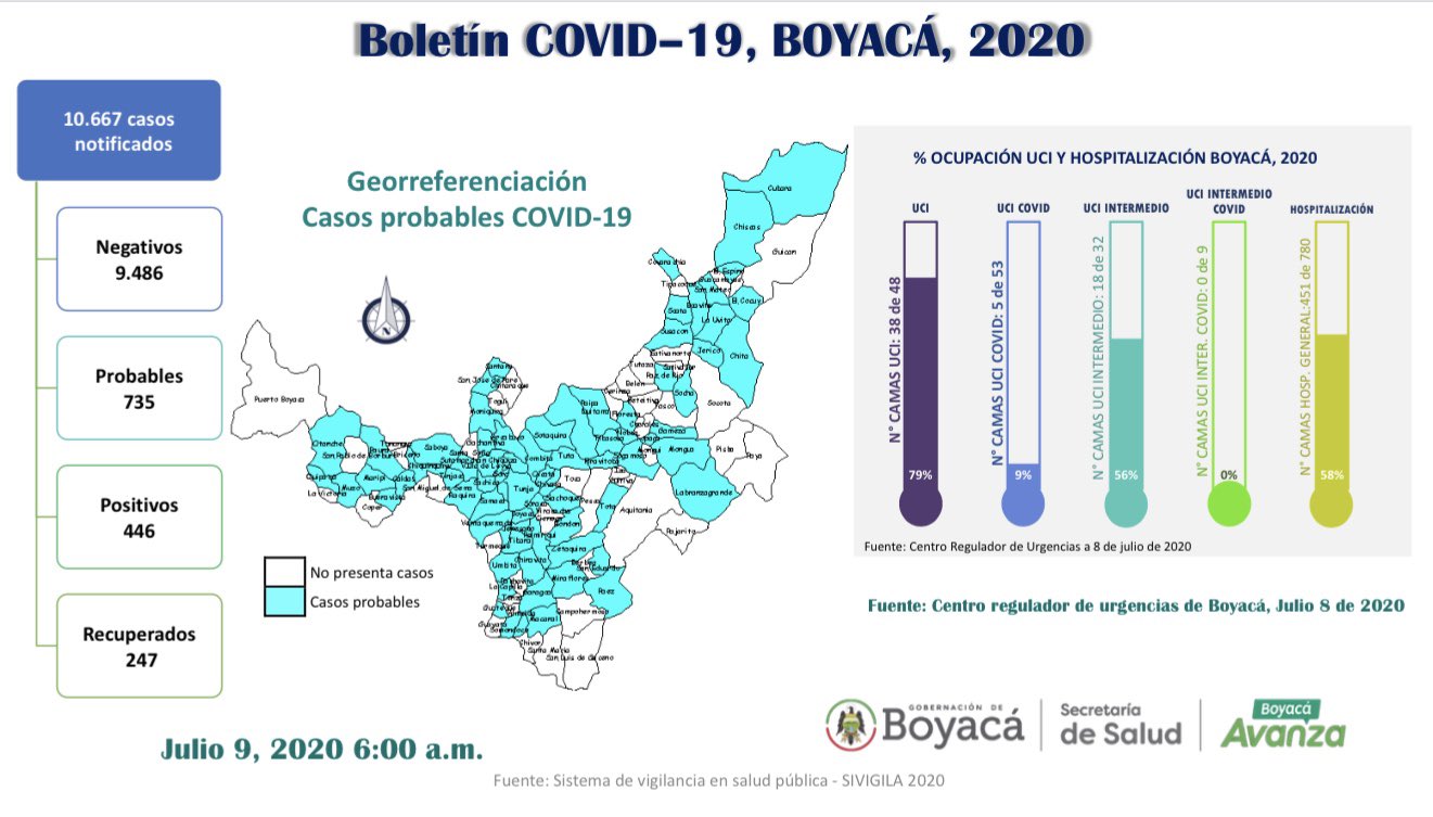 #NUEVO Hoy 9 de julio, a las 6:00 a.m., equipo de Vigilancia en Salud Pública confirma 10.667 tomas de muestras, en 119 municipios de Boyacá, de las cuales: