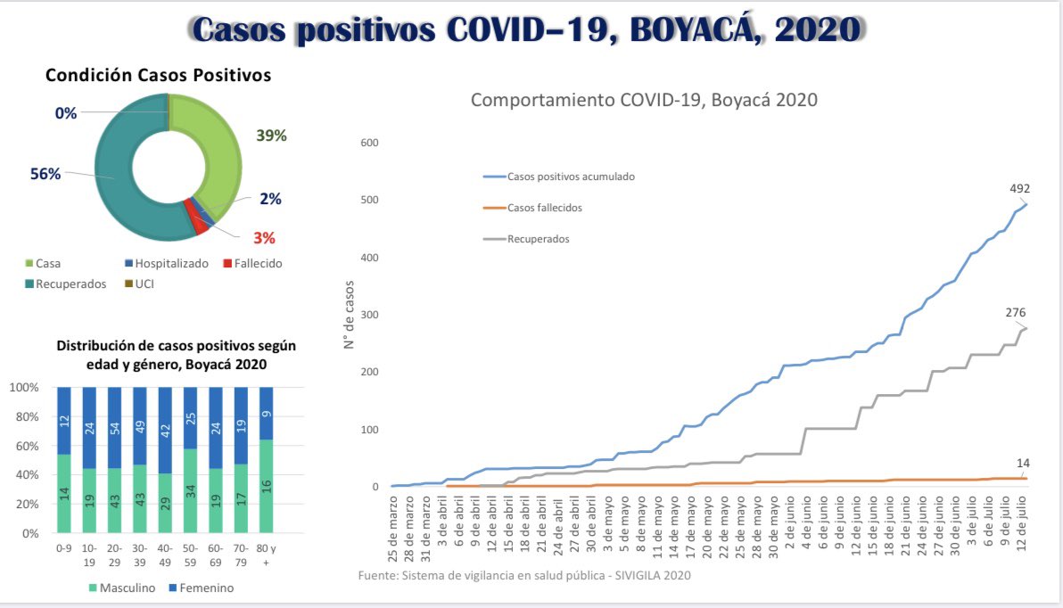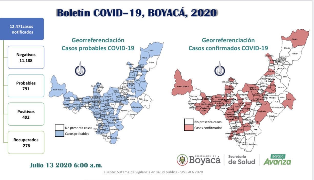 Para hoy 13 de julio, a las 6:00 a.m., equipo de Vigilancia en Salud Pública confirma 12.471 tomas de muestras, en 121 municipios de Boyacá, de las cuales:
