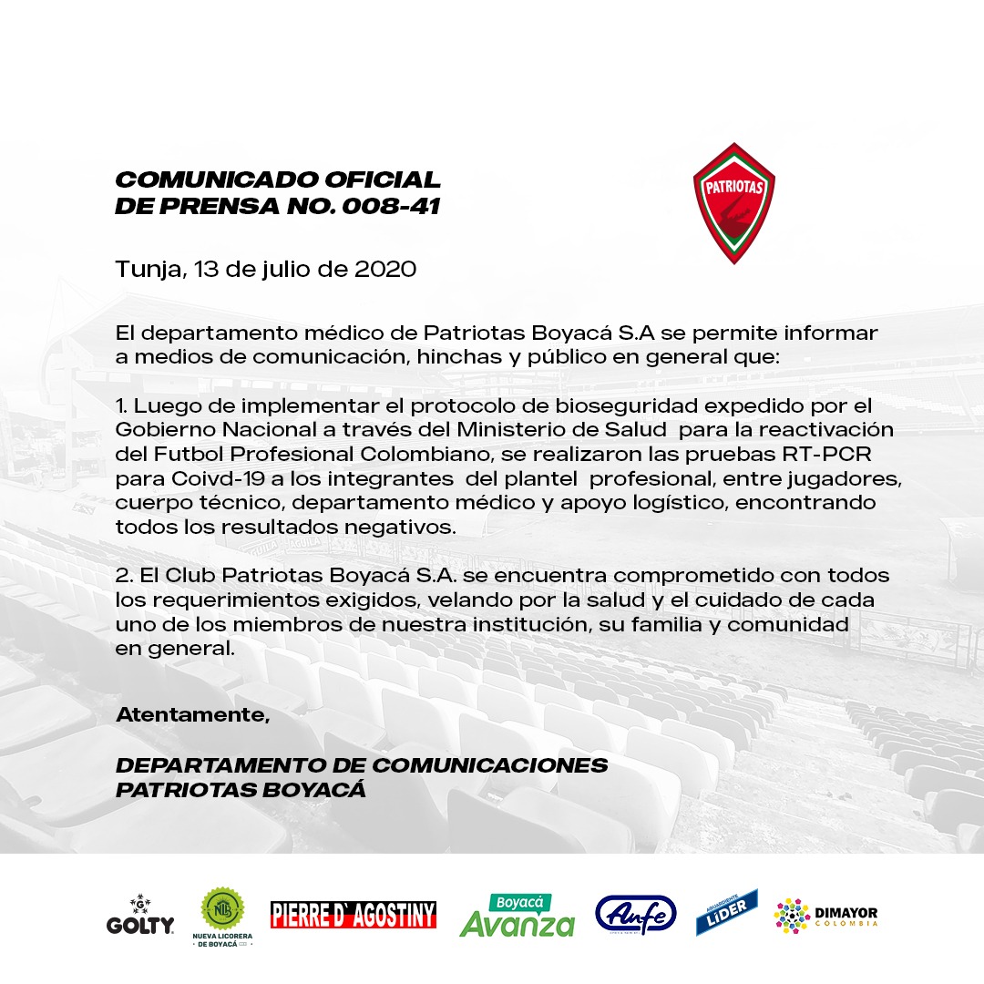 El equipo boyacenses confirmó que luego de realizar las pruebas PCR para Coronavirus los resultados fueron negativos