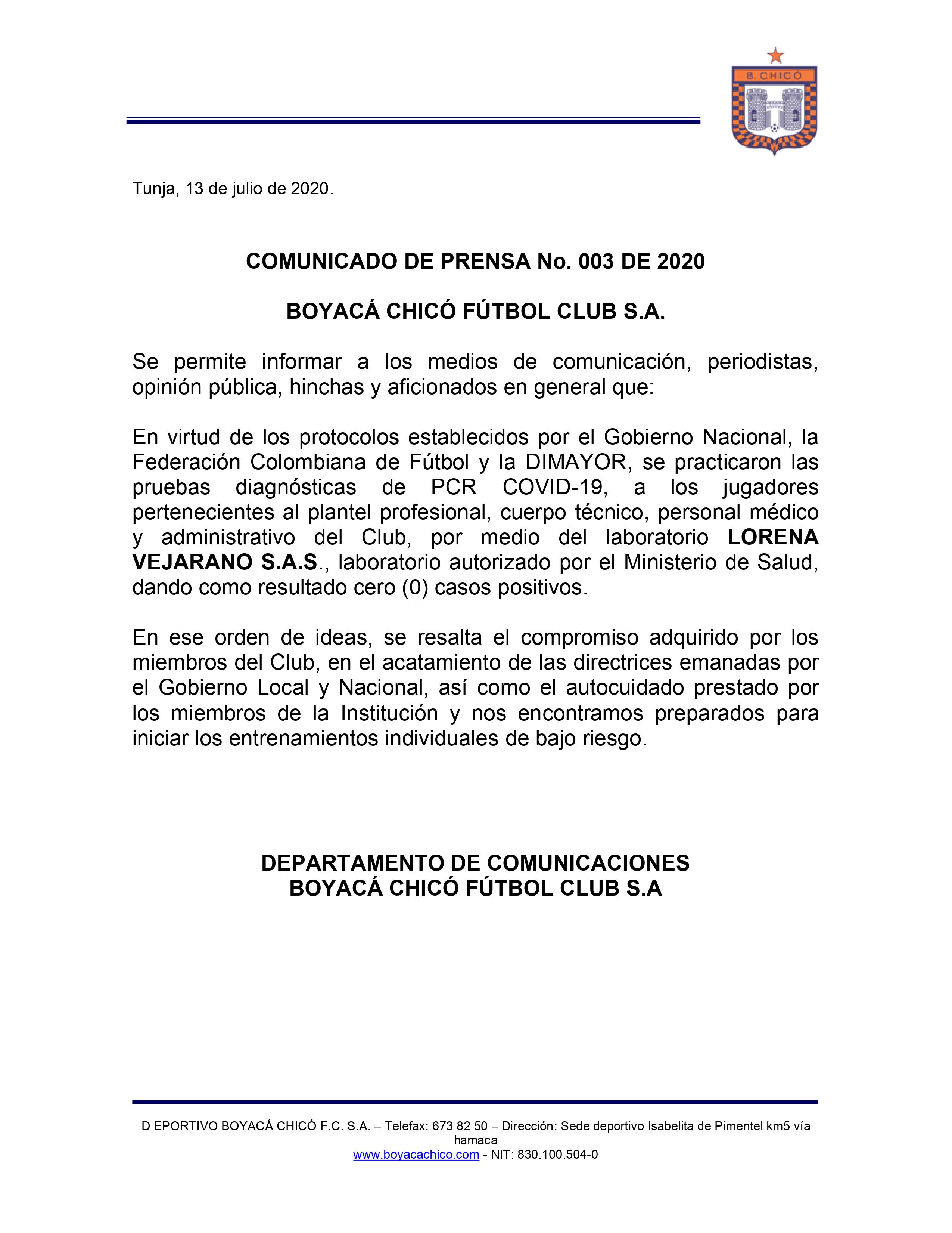 De acuerdo con el comunicado las pruebas fueron aplicadas a jugadores, cuerpo médico, administrativo y colaborador dando como resultado a todas las pruebas negativo.