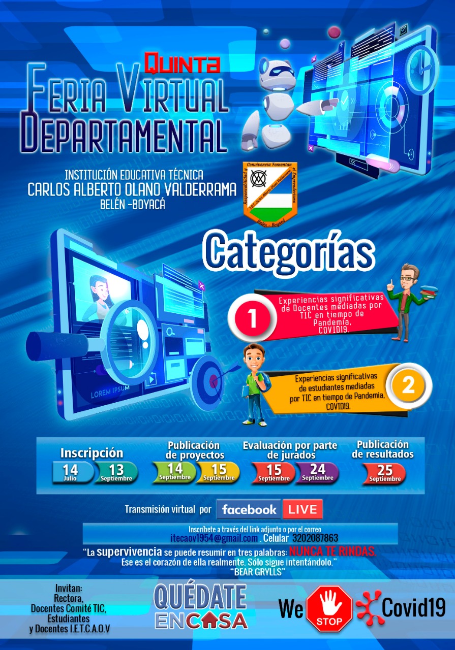 La Institución Educativa Técnica ‘Carlos Alberto Olano Valderrama’ del municipio de Belén invita a rectores, docentes y estudiantes de las instituciones educativas del Departamento de Boyacá a participar en la Feria Virtual Departamental, que se realizará el 25 de septiembre