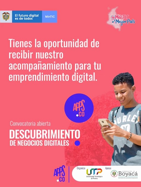Las secretarías de TIC y Gobierno Abierto y de Desarrollo Empresarial de Boyacá invitan a todos los boyacenses que se encuentren desarrollando algún emprendimiento a participar en la convocatoria ´Descubrimiento de negocios digitales’ del programa APPS.CO del Ministerio de las Tecnologías de la Información y las Comunicaciones.