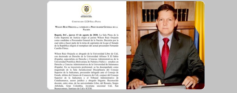 Corte Suprema de Justicia terna a Wilson Ruiz como candidato a Procurador General de la Nación