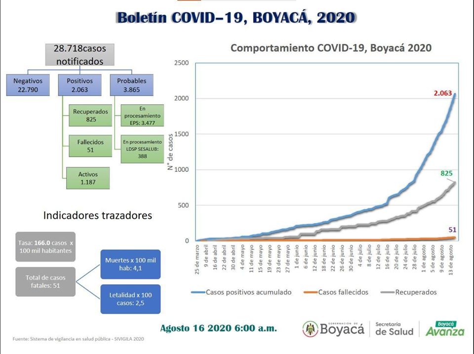 Hoy 16 de agosto, a las 6:00 a.m secretaria de Salud de Boyacá reporta @SSaludBoyaca