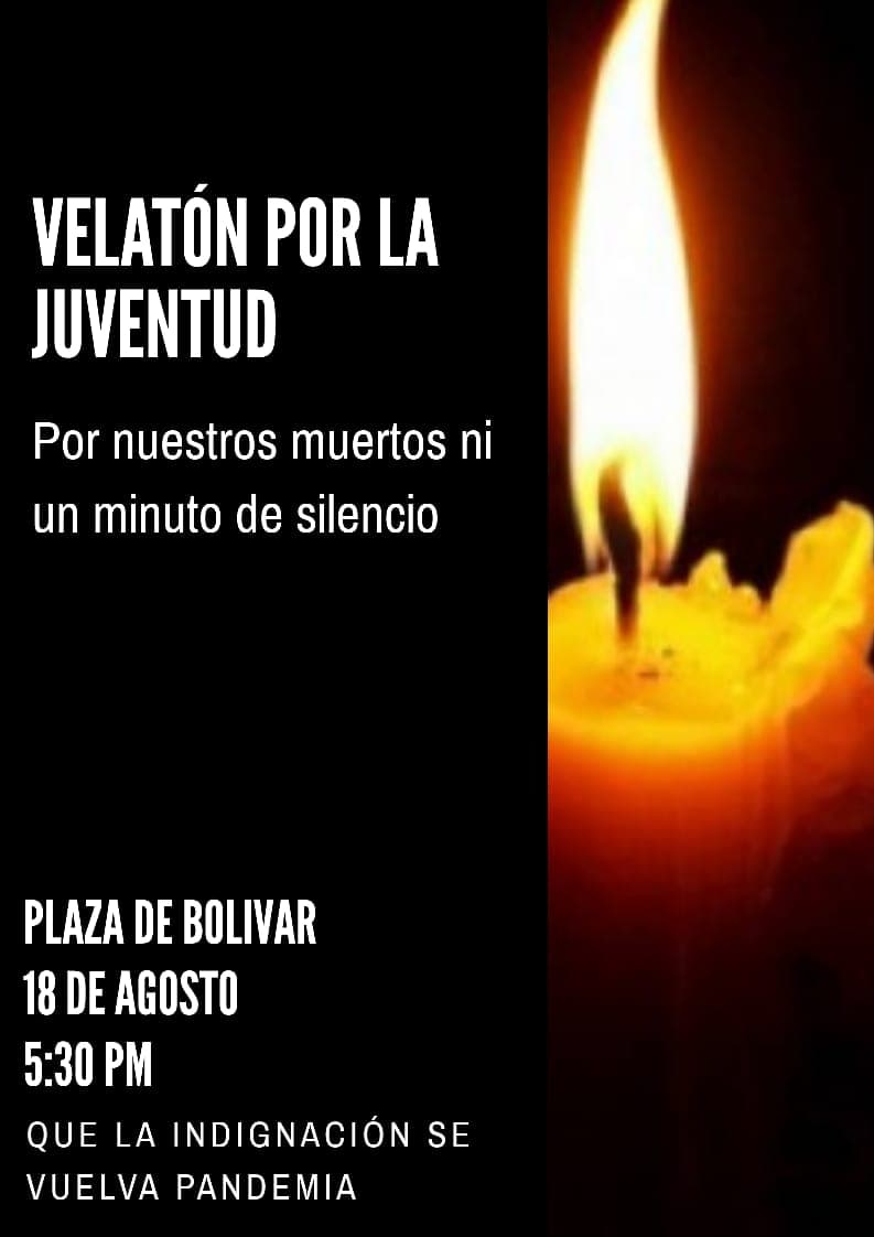 En Tunja, capital de los boyacenses varios jóvenes se reunirán en la Plaza de Bolívar este martes 18 de agosto, para llevar a cabo la velatón por la juventud en rechazo a los asesinatos que se vienen presentando en Colombia, la actividad dará inicio sobre las 5:30 de la tarde.
