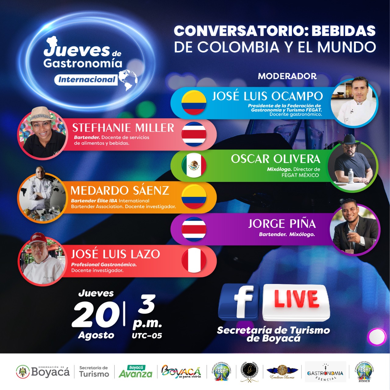 En esta oportunidad se contará con la participación de José Luis Ocampo Aguirre, presidente de la Federación de Gastronomía y Turismo (FEGAT) Colombia, quien será el moderador del evento; Stefhanie Miller Segura es bartender y junto con el mixólogo, Jorge Luis Medina Piña, representarán a Costa Rica; de México hará parte Oscar Olivera, también mixólogo y director de FEGAT México; el peruano José Luis Lazo, profesional gastronómico e investigador; y el colombiano, Medardo Sáenz Monsalve, bartender Élite IBA (International Bartender Association).