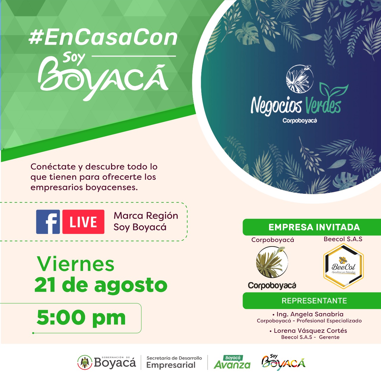 El sector de la apicultura con la producción y comercialización de productos naturales y saludables derivados de la miel, del emprendimiento Beecol SAS originado en municipio de Tibasosa y los “Negocios Verdes”, iniciativa del Ministerio de Ambiente y Desarrollo Sostenible, con el acompañamiento de las Corporaciones Autónomas Regionales, tendrán espacio en el programa virtual de la Secretaría de Desarrollo Empresarial y la estrategia de Marketing Territorial #EnCasaConSoyBoyacá, este viernes 21 de agosto.