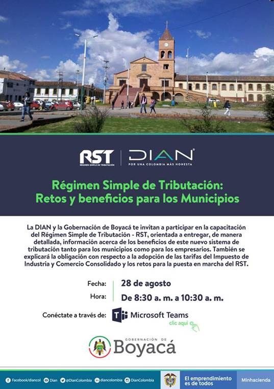 La Dirección de Impuestos y Aduanas Nacionales –DIAN- y la Gobernación de Boyacá realizarán la capacitación “Régimen simple de tributación: retos y beneficios para los municipios”, dirigida a los secretarios de hacienda de los 123 municipios de Boyacá, profesionales y comunidad en general.