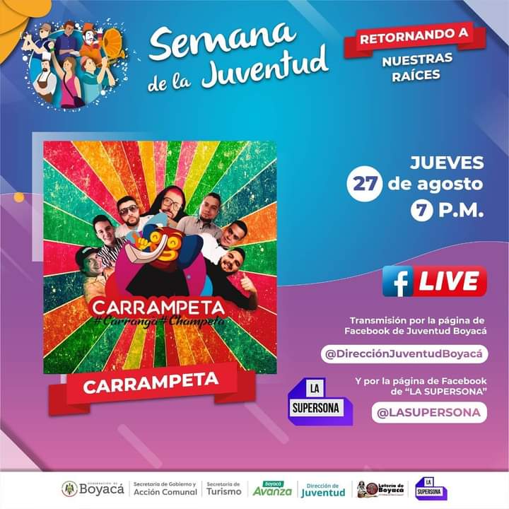 La Semana de la Juventud Boyacá 2020 sigue su curso, para mañana jueves la programación reúne una serie de eventos ara todos los gustos: oOratoria, educación, TIC, la paz en occidente, arte, cultura y mucho más que cerrará el día con la presentación de la agrupación boyacense Carrampeta.