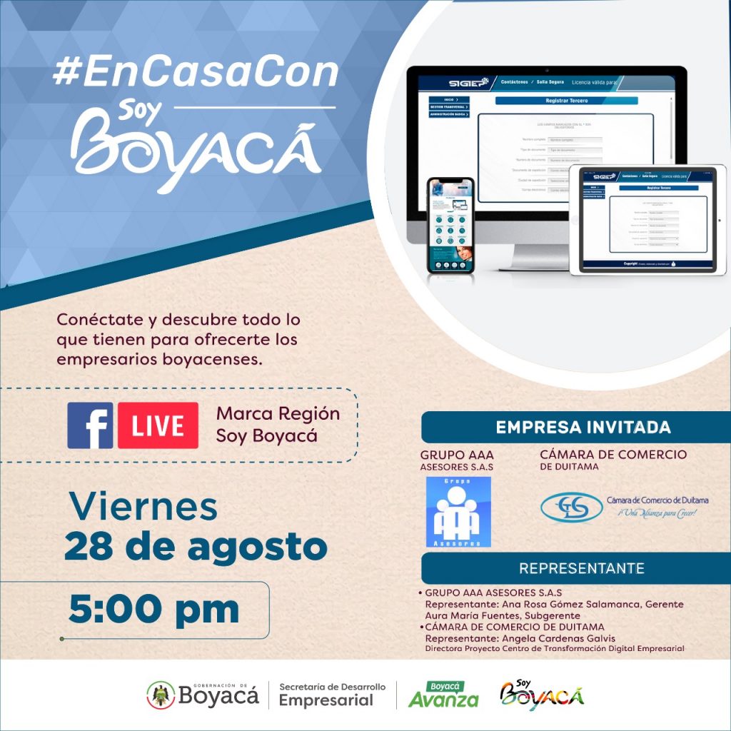 La tecnología y la innovación tendrán espacio este viernes 28 de agosto, en el programa de la Secretaría de Desarrollo Empresarial #EnCasaConSoyBoyacá que reunirá a las empresas - Grupo AAA Asesores S.A.S. dedicada al desarrollo, implementación, capacitación y soporte de software y la Cámara de Comercio de Duitama, entidad que viene promoviendo el Centro de Transformación Digital Empresarial.