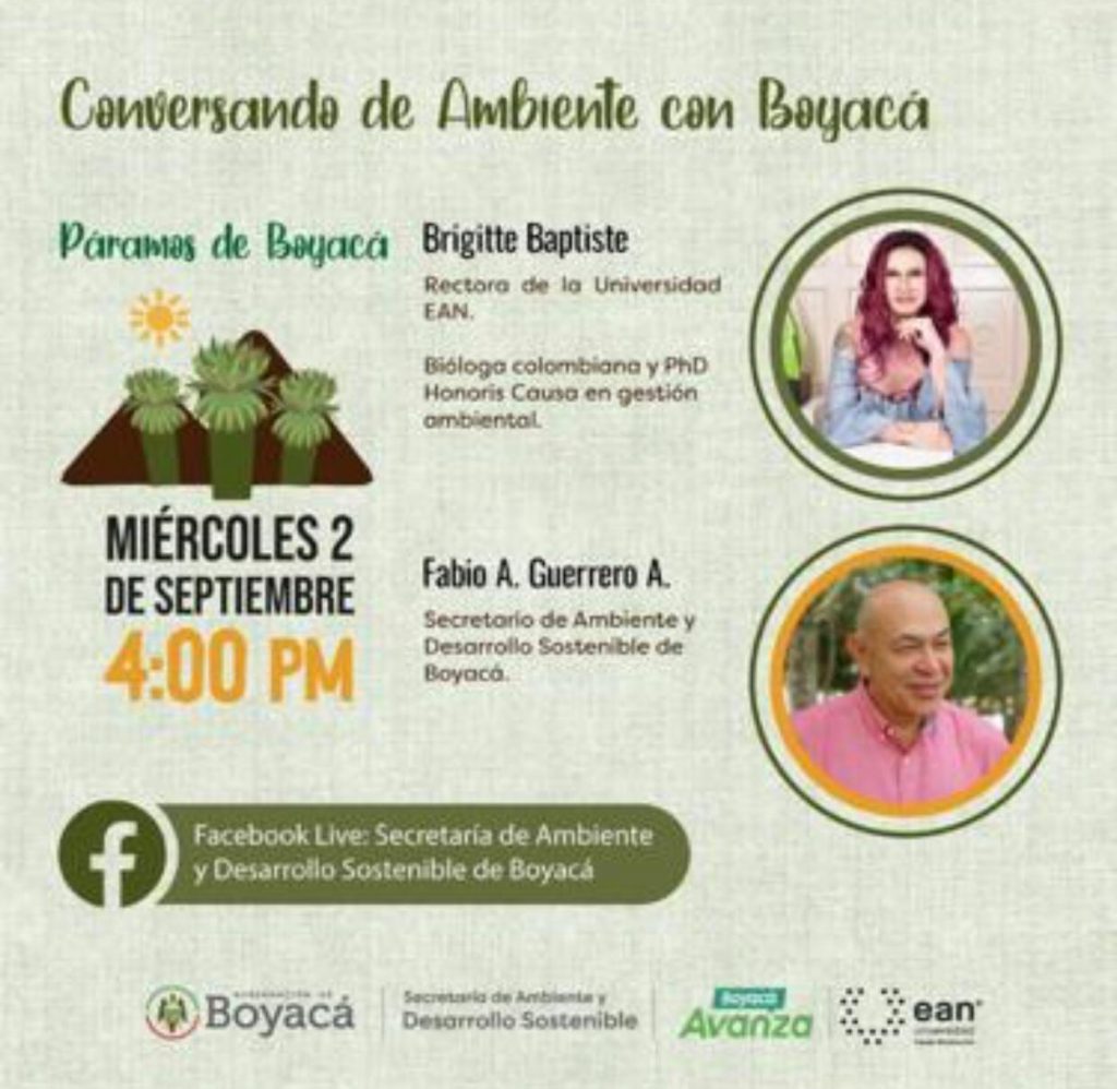 Este miércoles 2 de septiembre a partir de las 4 p.m. Brigitte Baptiste bióloga colombiana, experta en temas ambientales y biodiversidad en Colombia, Ex directora del Instituto de Investigación de Recursos Biológicos, Alexander von Humboldt, y actualmente rectora de la Universidad EAN, estará participando en el conversatorio “Conversando de Ambiente con Boyacá, Páramos de Boyacá”
