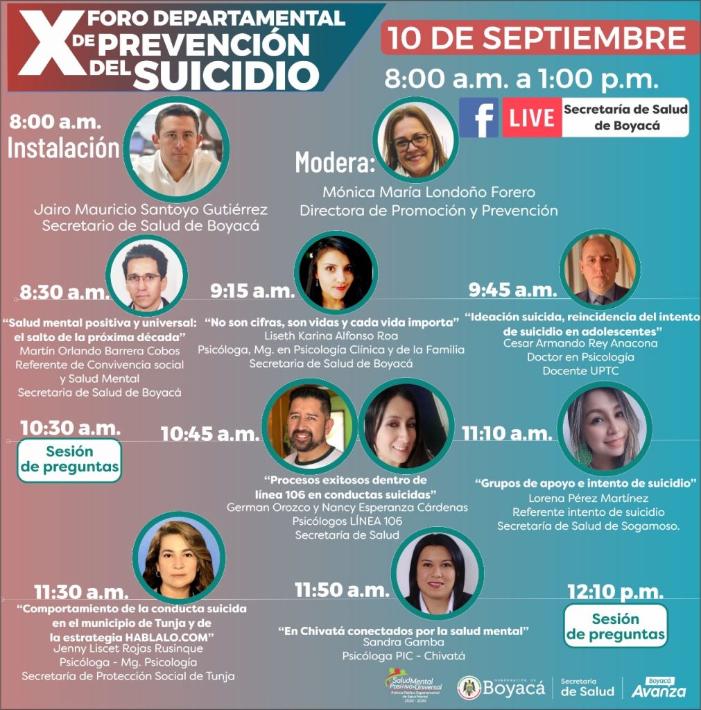 Mejorar las prácticas cotidianas de autocuidado de la salud mental y el uso de redes familiares, sociales e institucionales, para prevenir y reducir el impacto de la conducta suicida en la población boyacense, es el objetivo del X Foro Departamental de Prevención del Suicidio, que se realizará de manera virtual, a través del Facebook Live de la Secretaría de Salud de Boyacá, este jueves 10 de septiembre, desde las 8:00 a.m.