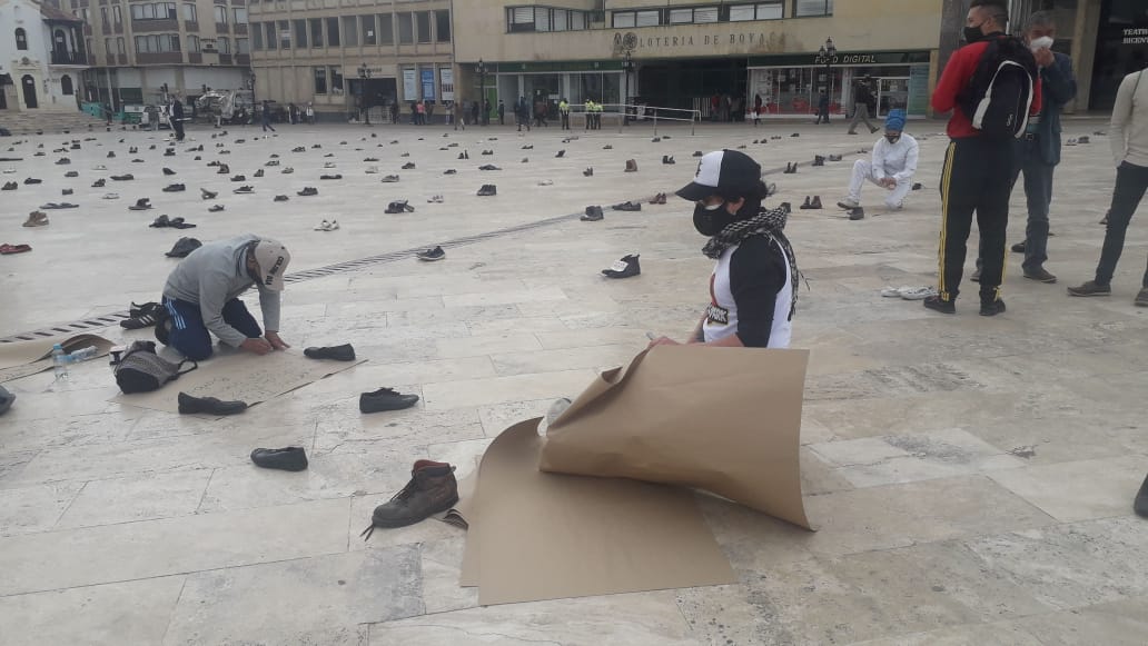 Adicionalmente protesta de forma pacífica decorando la Plaza de Bolívar con zapatos que hacen simbología a quienes han sufrido masacres, abuso policial u afectación con la reforma laboral del decreto 1174.