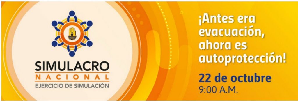 El próximo 22 de octubre a las 9:00 de la mañana se desarrollará el “Simulacro Nacional – Ejercicio de Simulación”, actividad fundamental para la gestión del riesgo, en esta versión no se realizarán las habituales evacuaciones físicas y traslados a los puntos de encuentro debido a la pandemia del COVID-19, sino que se aprovechará para realizar simulaciones en cada uno de los consejos municipales de gestión del riesgo, de tal manera que se evalué los planes existentes poniendo a prueba las estrategias para atención de emergencias y se actualicen según lo analizado en este ejercicio, teniendo en cuenta el objetivo de reducir el riesgo.
