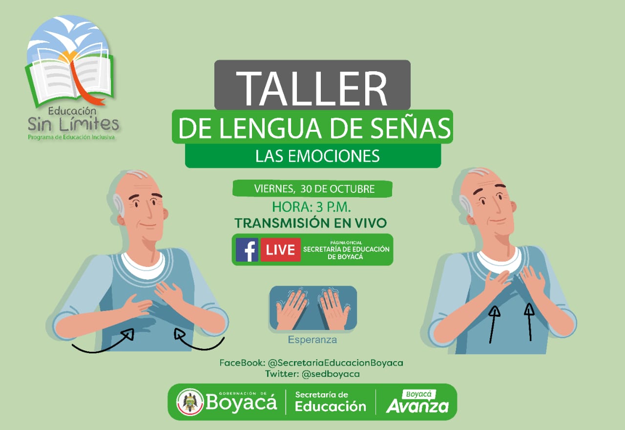 Este viernes 30 de octubre, el habitual Taller de Lengua de Señas Colombianas, organizado por la Gobernación de Boyacá, la Secretaría de Educación de Boyacá y el Programa Educación sin Límites, cambia temporalmente su horario de transmisión, en esta nueva entrega se podrán conectar a partir de las 3:00 de la tarde, y aprender las diferentes formas de expresar las emociones en este lenguaje.