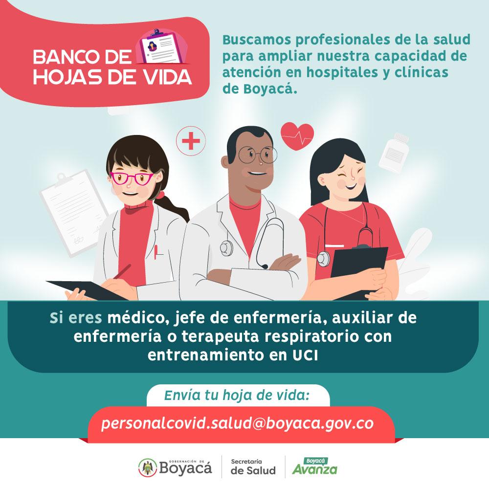 Los interesados pueden enviar su hoja de vida al correo electrónico personalcovid.salud@boyaca.gov.co.