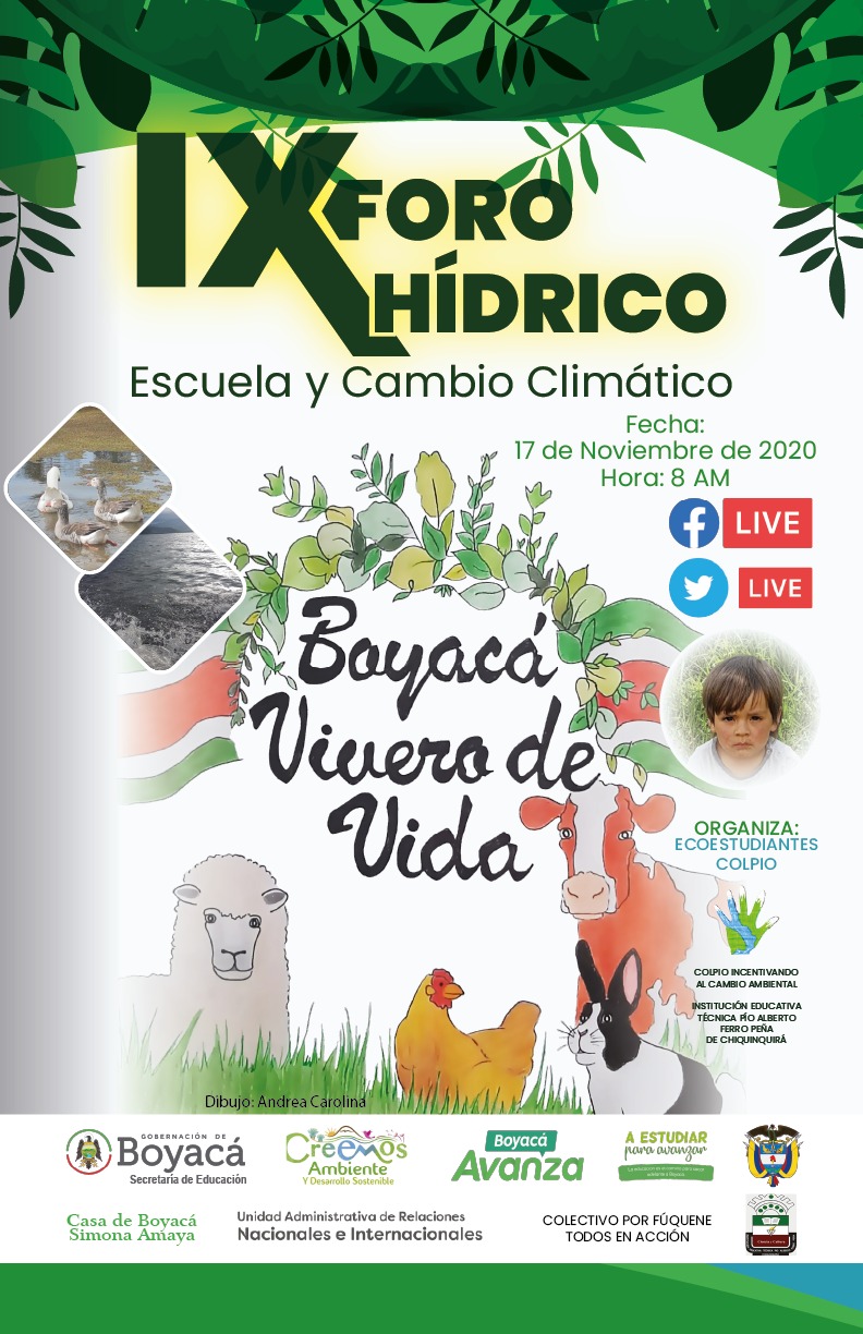 El próximo 17 de noviembre de 2020, Día del Ambientalista Latinoamericano, se realizará la novena versión del Foro Hídrico, que por nueve años consecutivos, la Institución Educativa Técnica ‘Pío Alberto Ferro Peña’ de Chiquinquirá con el tema Escuela y Cambio Climático.