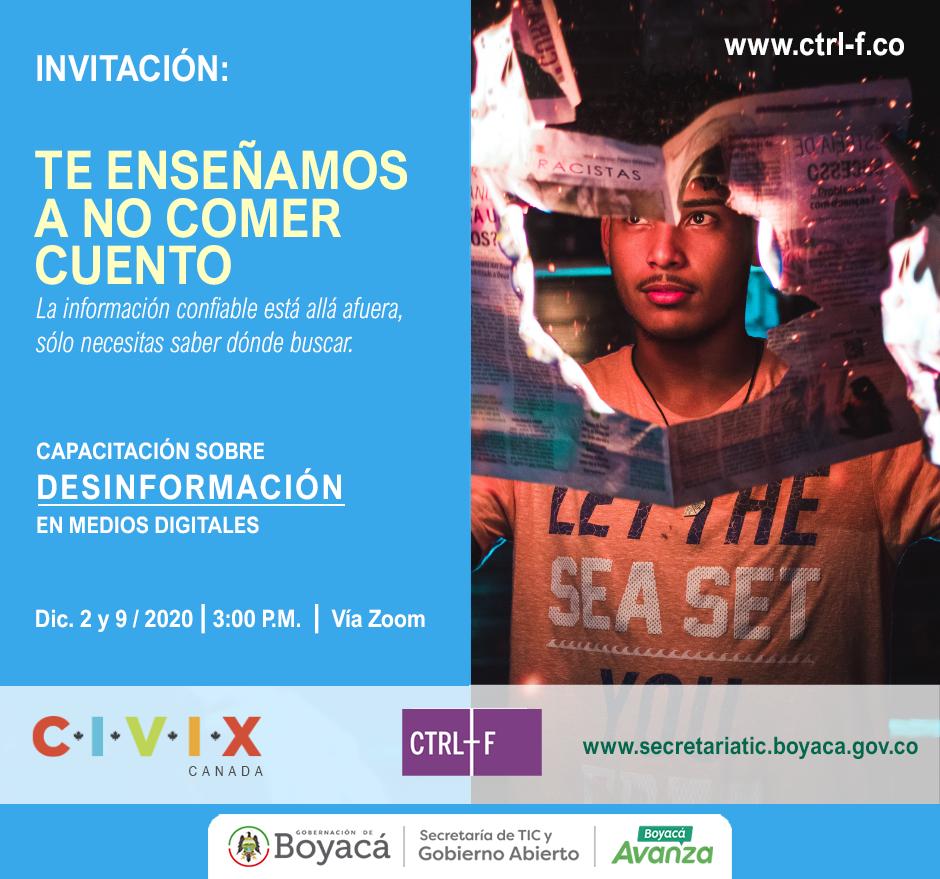 La Secretaría de TIC y Gobierno Abierto de Boyacá, en cabeza de John Amaya, invita a todos los funcionarios que hacen parte de los Punto Vive Digital, a periodistas, comunicadores y funcionarios interesados del departamento, a la capacitación ‘Desinformación en medios digitales Ctrl+F’.