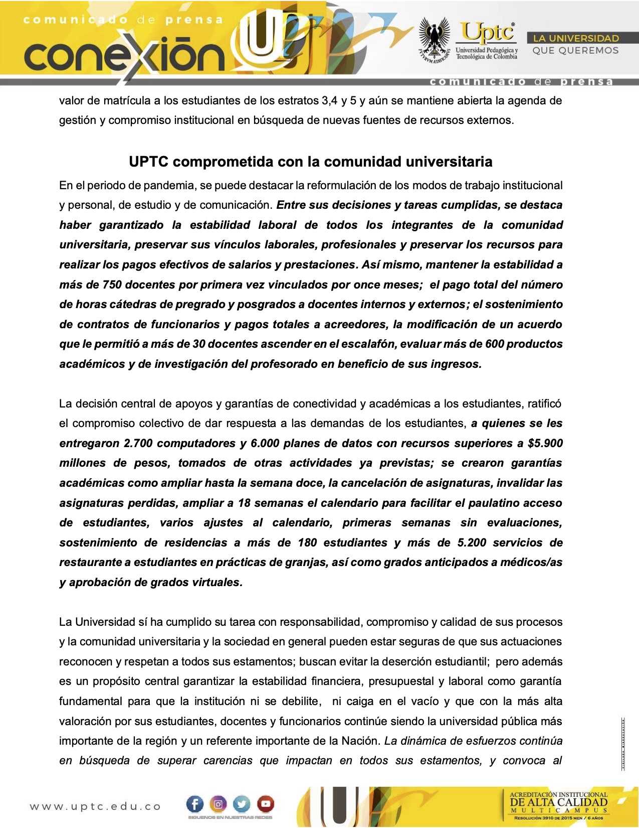 Asegura que para subsistir durante el año de pandemia, la universidad debía disponer de 320.000 millones de pesos, de los cuales el Ministerio de Educación solo garantizó la mitad, la suma restante debía ser dada por la Universidad.