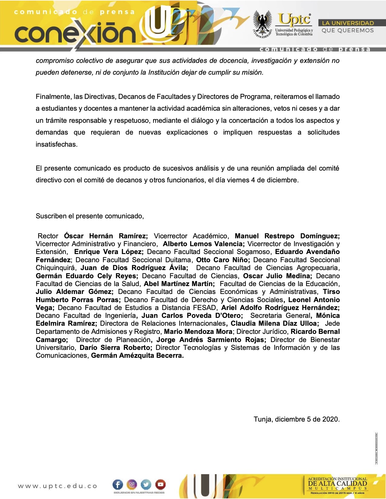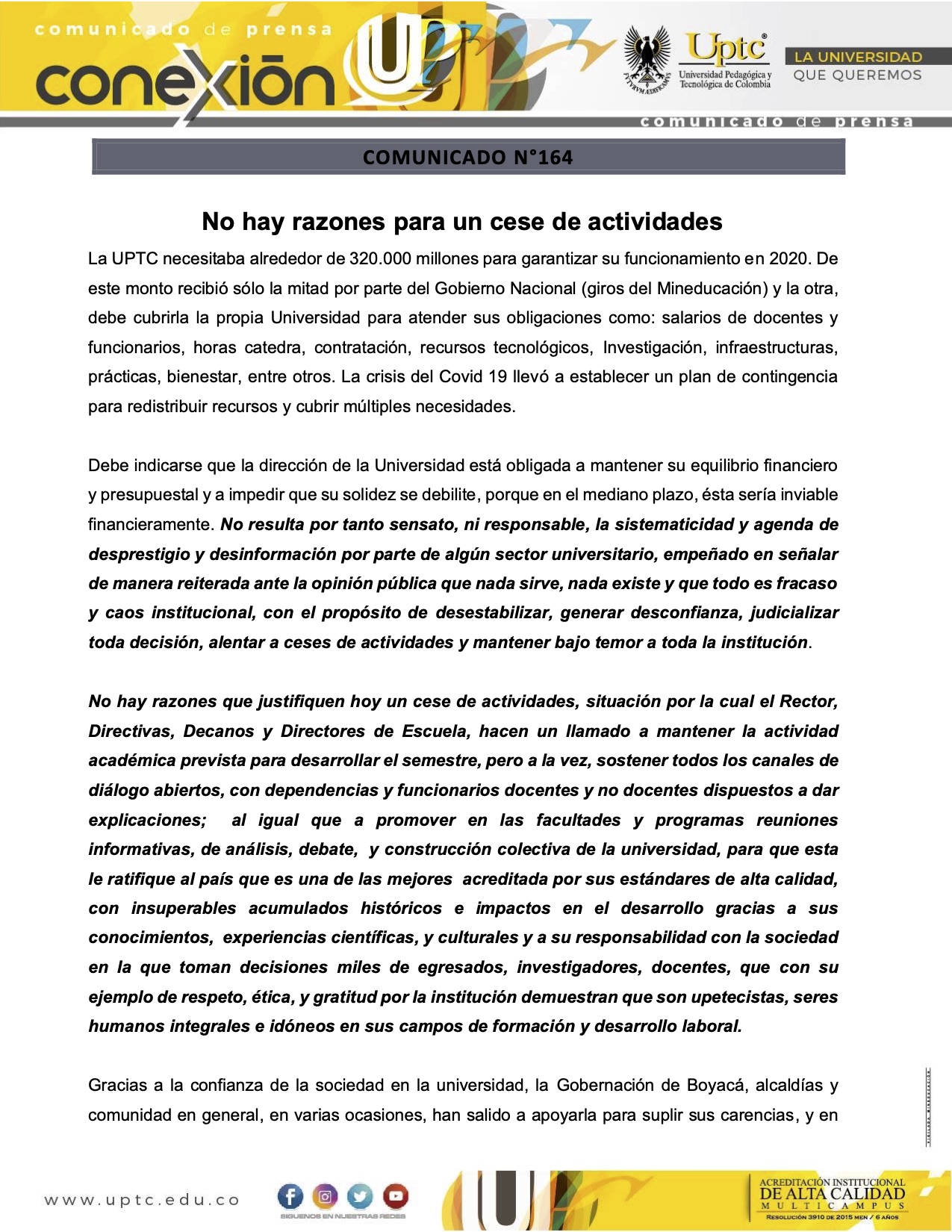 "No hay razón para un cese de actividades": UPTC