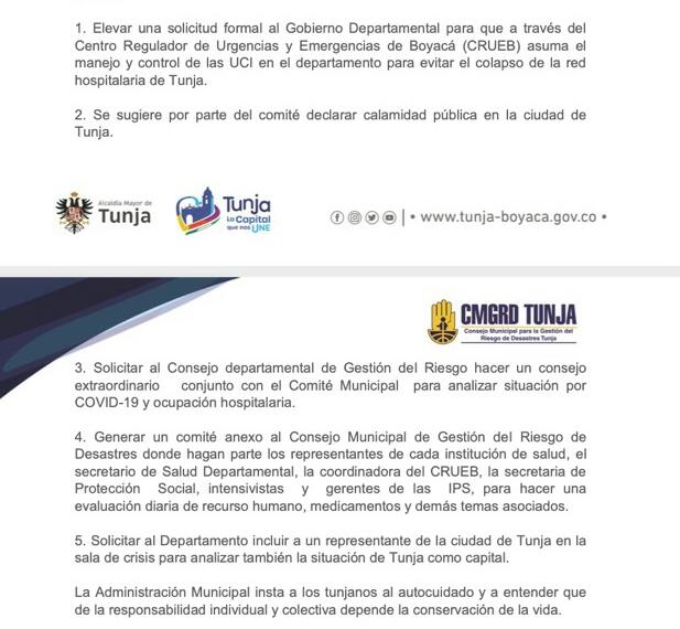 A pesar del aumento de medidas de contención en la capital boyacense, se alcanza paulatinamente el colapso hospitalario, por ello se estableció el alerta roja una vez que la ocupación de UCIs alcanzó el 88% y solo restan 14 camas disponibles.