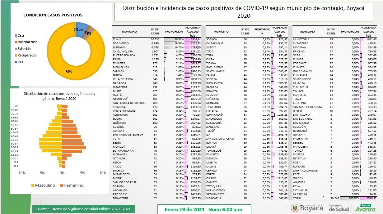 Para hoy 19 de enero, a las 6:00 a.m., elequipo de Vigilancia en Salud Pública @SSaludBoyaca confirma 141.145 tomas de muestras, de las cuales: