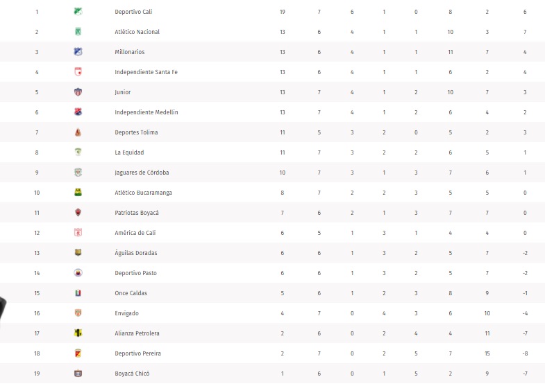 Al cabo de la jornada, en la tabla de posiciones del rentado nacional dejó a cuatro grandes en las primeras posiciones. Deportivo Cali es solitario líder con 19 puntos.