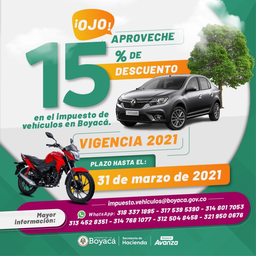 La Secretaría de Hacienda invita a los contribuyentes del impuesto de vehículos a no dejar el pago para los últimos días, les recuerda que hasta el 31 de marzo de 2021 hay plazo para pagar con 15% de descuento este tributo en Boyacá.