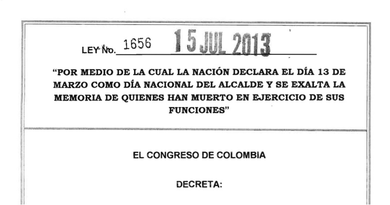 Por medio de la la Ley N° 1656 del 15 de julio de 2013, el Congreso de la República de Colombia declaró el día 13 de marzo como Día Nacional del Alcalde y se exalta la memoria de quienes han muerto en ejercicio de sus funciones