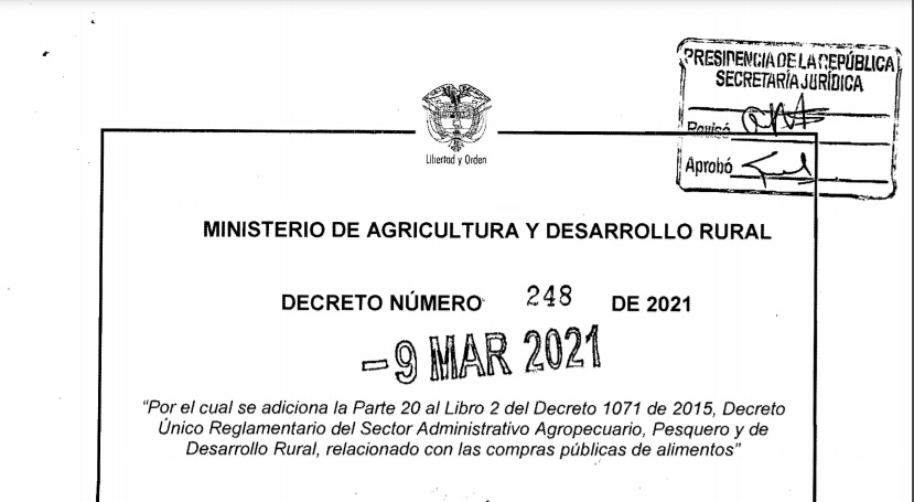 Gobierno entrega decreto 248 del 2021, en el que se establece que de ahora en adelante todas las compras públicas de alimentos que se hagan por parte de las entidades del Estado, deberán hacerse como mínimo un 30% a pequeños productores del campo