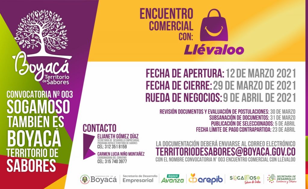 Este 12 de marzo de 2021 se abrió la convocatoria No. 003 ´Encuentro Comercial con Llevaloo´, una App aliada con el convenio No. 200820 de 2020 entre el Departamento de Boyacá, el Centro Regional de Gestión para la Productividad y la Innovación de Boyacá – CREPIB y el Municipio de Sogamoso.