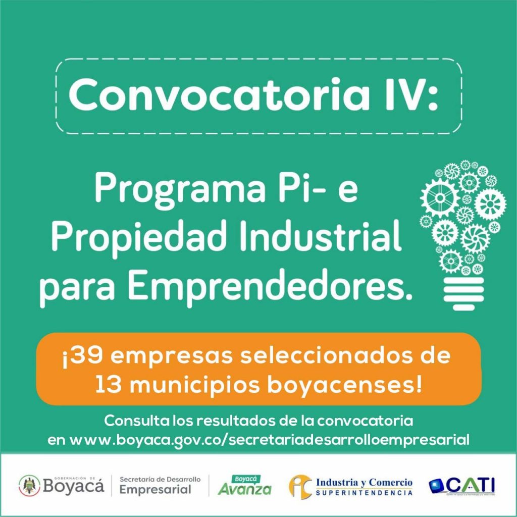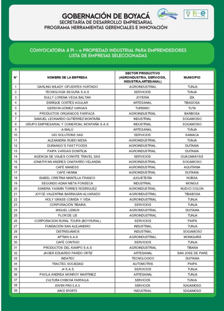 La Secretaría de Desarrollo Empresarial de la Gobernación de Boyacá - Programa Herramientas Gerenciales e Innovación y el Centro de Apoyo a la Tecnología y la Innovación de la Superintendencia de Industria y Comercio, dan a conocer los resultados de la Convocatoria IV: Programa PI-e Propiedad Industrial para Emprendedores, en la que fueron seleccionadas 39 empresas de sectores productivos: Agroindustrial, Servicios, Artesanal, Juguetería, Turismo, Tecnológico, Automotriz e Industrial, que representan los siguientes 13 municipios del departamento: Tunja, Iza, Tibasosa, Tuta, Sogamoso, Samacá, Duitama, Guacamayas, Aquitania, Nobsa, Monguí, Nuevo Colón y Paipa.