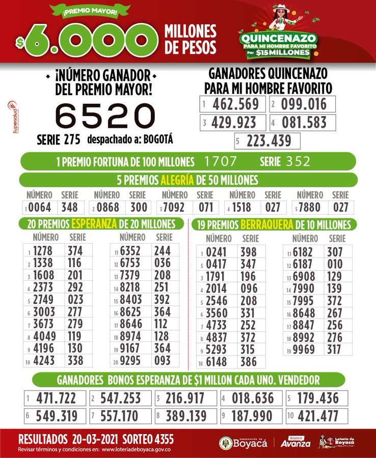 Resultados del sorteo No 4355 de la Lotería de Boyacá realizado el 20 de marzo de 2021