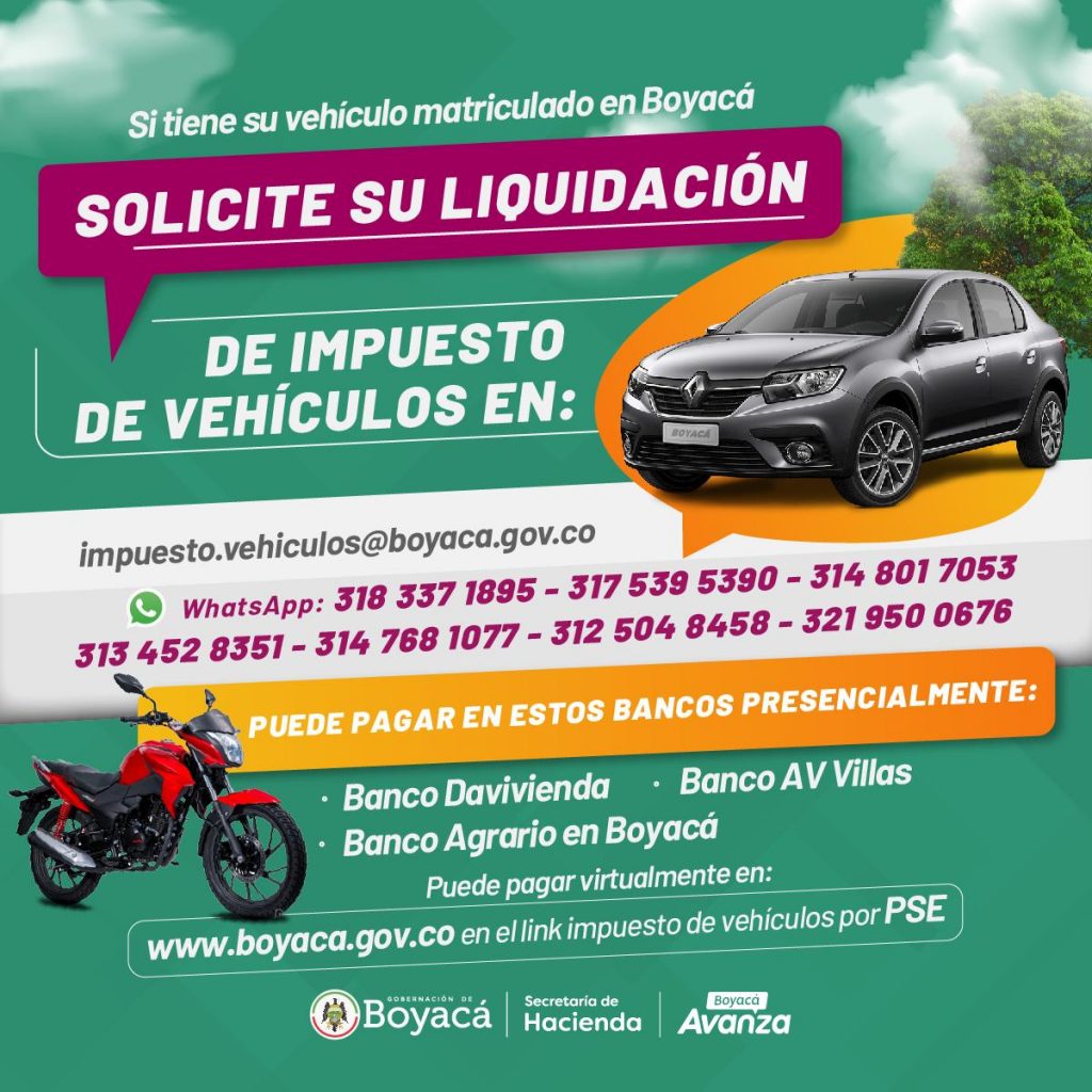 Las personas interesadas en realizar el trámite pueden solicitar la liquidación al correo electrónico impuesto.vehiculos@boyaca.gov.co o a las líneas de whatsapp 318 3371895, 317 5395390, 314 8017053, 313 4528351, 314 7681077, 312 5048458 y 321 9500676.