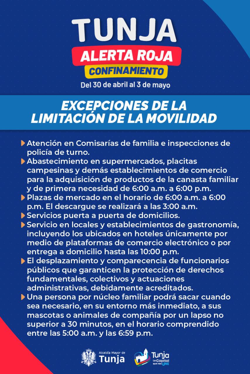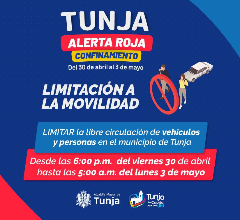 En la capital boyacense se limita la libre movilidad a partir del viernes 30 de abril, desde las 6:00 p.m hasta las 5:00 a.m del lunes 3 de mayo. A continuación las medidas dispuestas por la administración municipal.