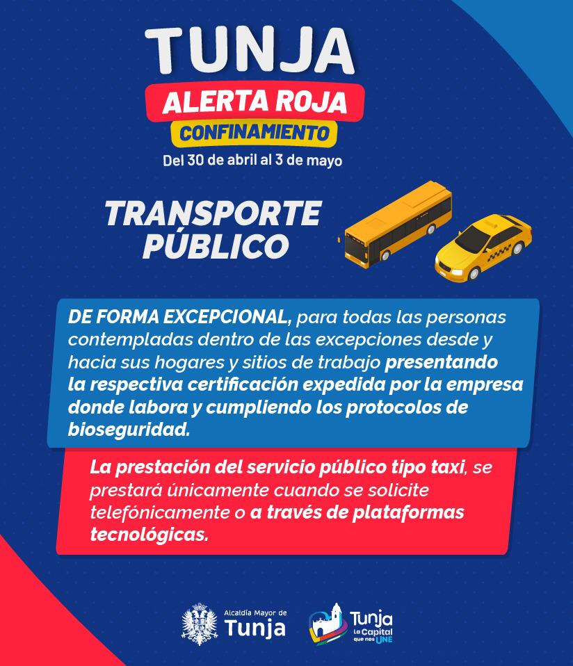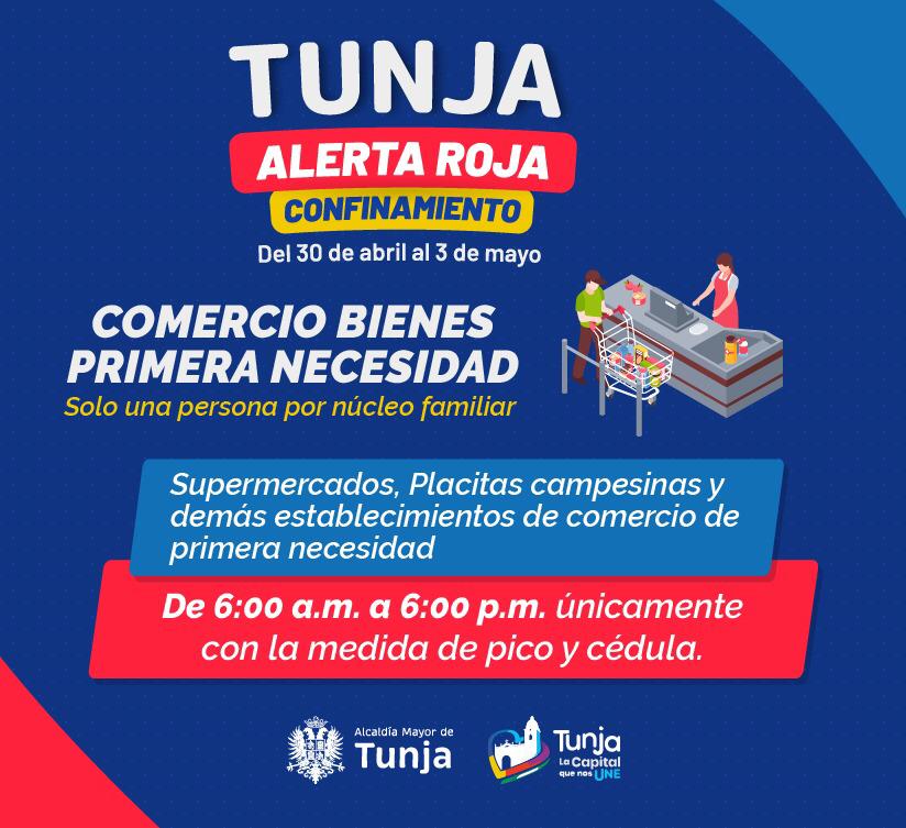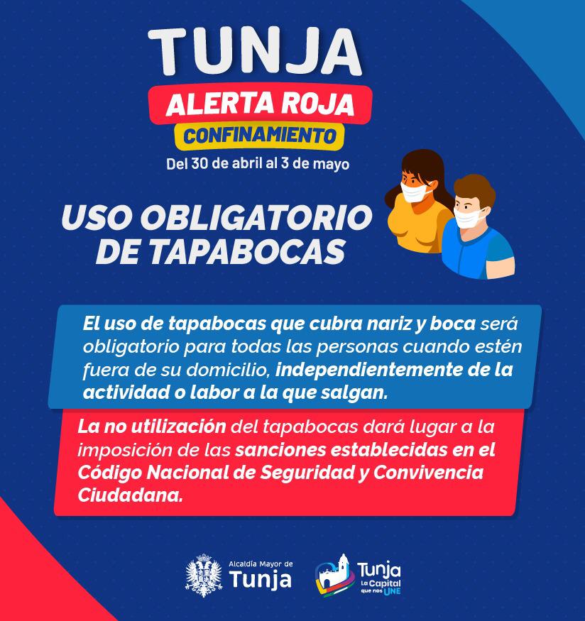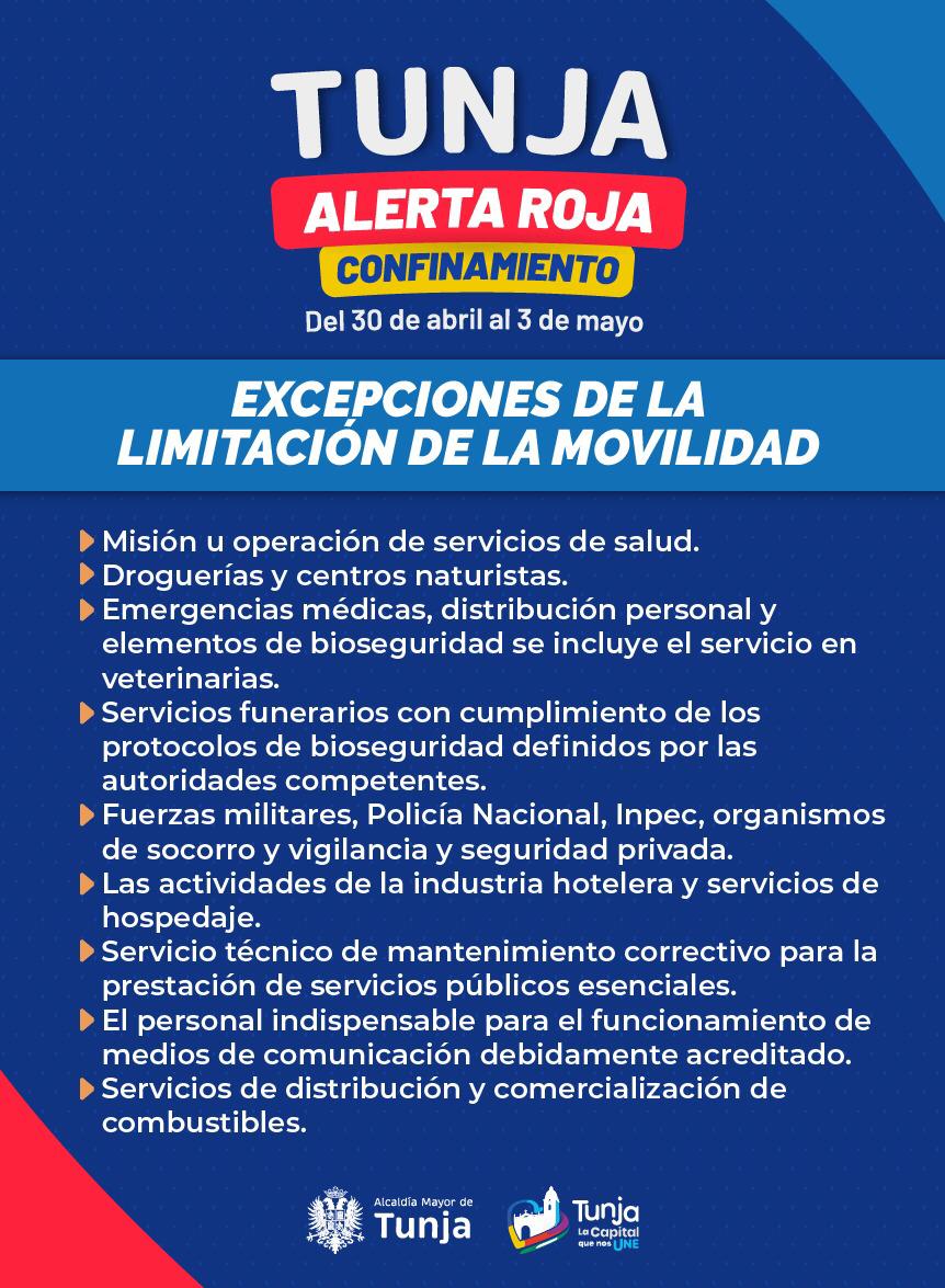 Teniendo en cuenta el aumento de la ocupación de las camas UCI de la red hospitalaria de Tunja, la Administración municipal decretó un confinamiento total y permanente entre este viernes 30 de abril, a partir de las 6.00 p.m., hasta el lunes 3 de mayo, a las 5:00 a.m.
