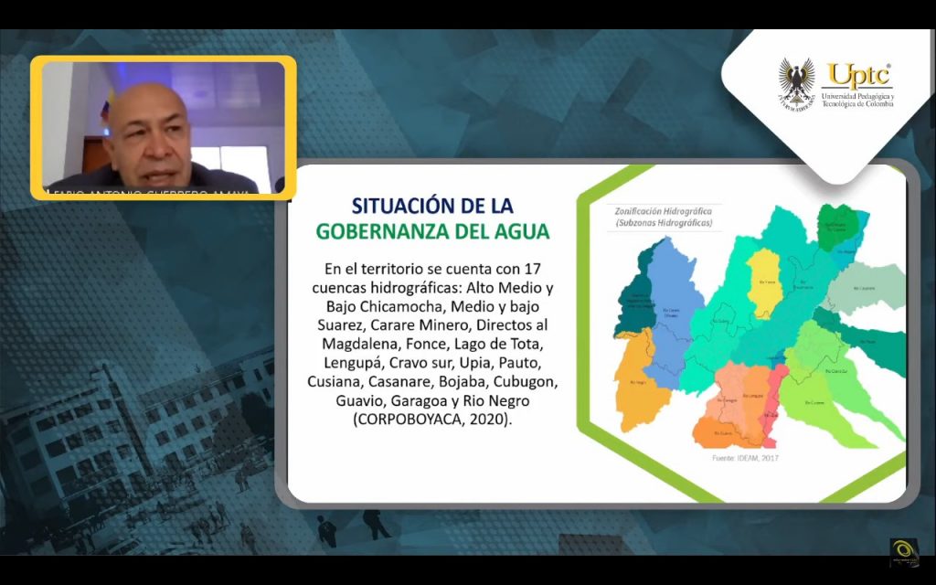 La Escuela de Ciencias Naturales y Educación Ambiental de la Uptc lideró el desarrollo del evento, con el objetivo de propiciar un espacio de intercambio para la gestión de conocimiento sobre la formulación de un marco conceptual y materialización de la Gobernanza del Agua para Colombia, región Boyacá, a partir de la socialización de la lectura del territorio, los aprendizajes y lecciones aprendidas de diferentes actores (sector privado, institucionalidad pública, actores políticos y sociales, y organizaciones de base).