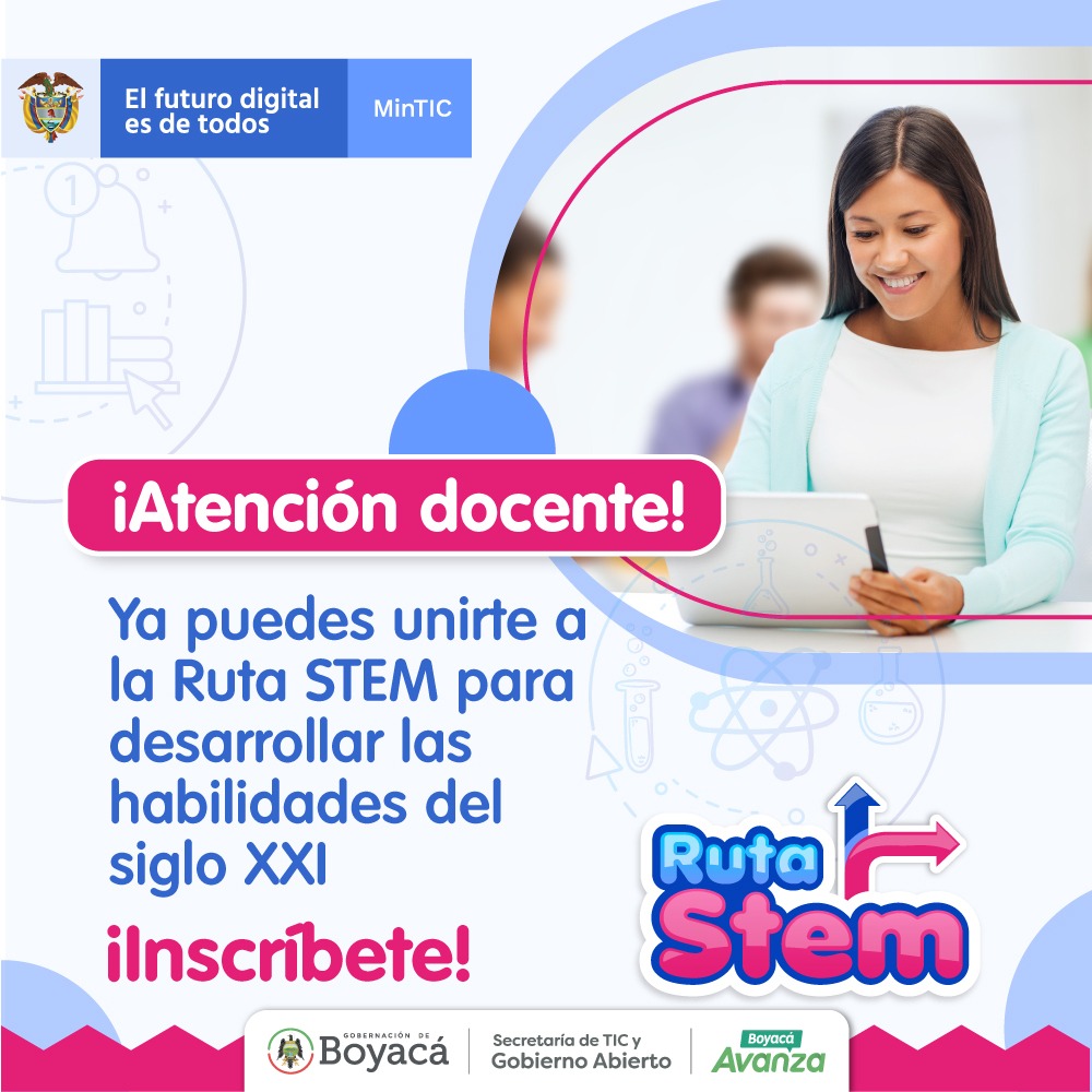 La Gobernación de Boyacá, a través de la Secretarías de TIC y Gobierno Abierto y de Educación, invita a todos los docentes de los colegios oficiales del departamento a participar en la convocatoria Ruta STEM 2021, del Ministerio de Tecnologías de la Información y Comunicaciones (Min TIC).