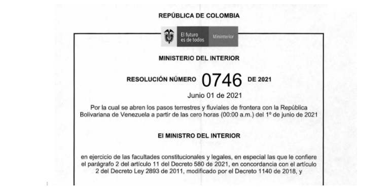 El artículo primero de la parte resolutiva indica que "se autoriza a la Unidad Administrativa Especial Migración Colombia, la apertura gradual de los pasos terrestres y fluviales de la frontera con la República Bolivariana de Venezuela, a partir de las 00:00 horas del 2 de Junio de 2021, sin perjuicio de que se continúen aplicando las medidas de bioseguridad establecidas por el Ministerio de Salud y Protección Social"