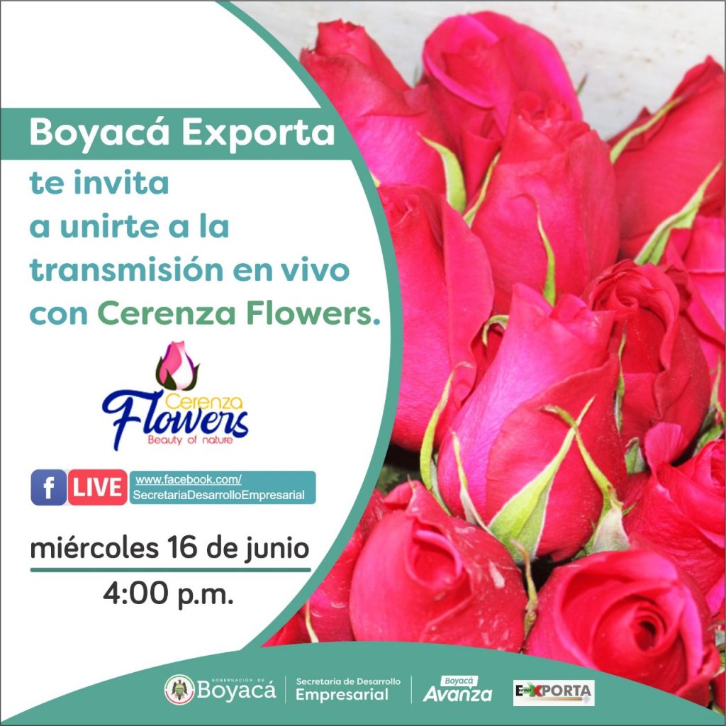 La Secretaría de Desarrollo Empresarial de la Gobernación de Boyacá invita a participar de la transmisión por facebook live, que se llevará a cabo este miércoles 16 de junio de 2021 a las 4:00 pm, en donde el gerente de la empresa reconocida Cerenza Flowers, contará su experiencia empresarial exportadora y cómo las herramientas gestionadas por la Dirección de Inversión y Comercio, le han funcionado para todo el proceso de exportación y acercamiento grandes con empresas internacionales.