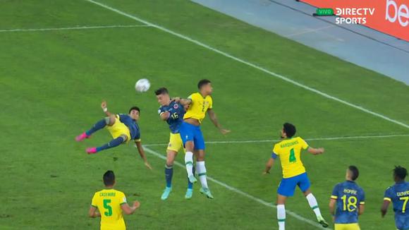 Aunque la presión y la intención de ataque desde el inicio fue de Brasil, la primera jugada de riesgo fue colombiana; un centro de Juan Guillermo Cuadrado desde la derecha terminó con un espectacular remate de chilena de Luis Diaz (10’), que dejó sin chance al arquero Weverton, para el 0-1.