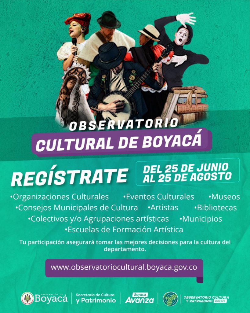 La Secretaría de Cultura y Patrimonio de Boyacá invita a los protagonistas y actores de la cultura a registrarse en esta plataforma digital en la página web www.observatoriocultural.boyaca.gov.co. Desde ya se podrá apreciar la información de organizaciones culturales, eventos culturales, museos, consejos municipales de cultura, artistas de diferentes áreas, bibliotecas, colectivos y/o agrupaciones artísticas, municipios y escuelas de formación artística y cultural.