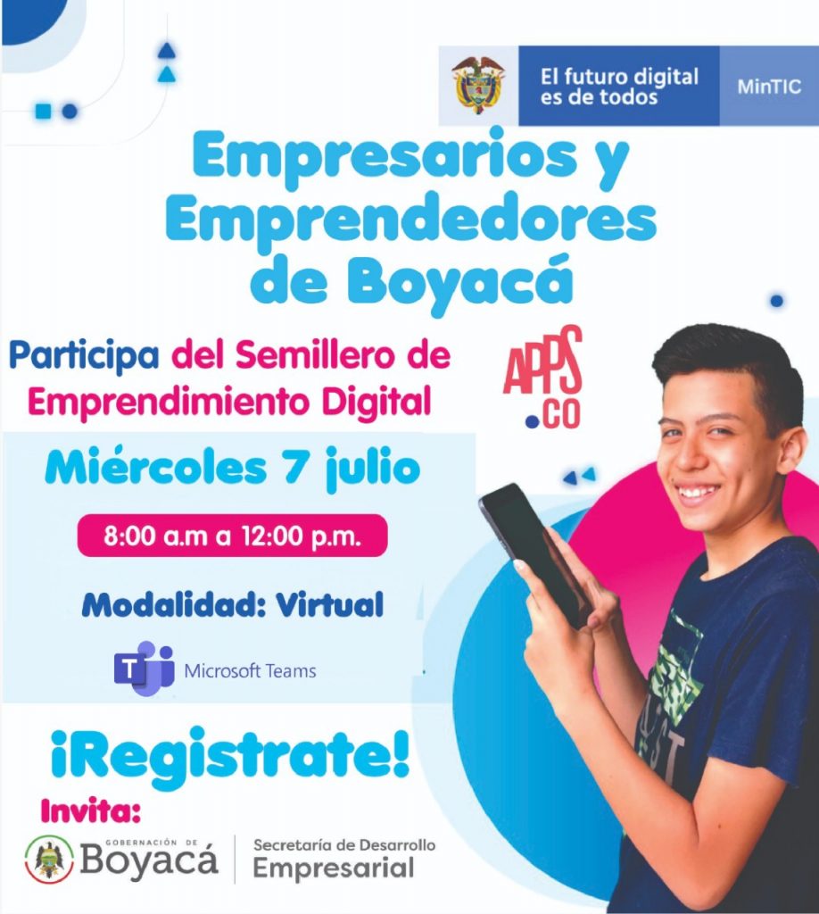 Empresarios y emprendedores boyacenses podrán participar en la jornada virtual liderada por el Ministerio de Tecnologías de la Información y las Comunicaciones -MinTIC- y la Secretaría de Desarrollo Empresarial de Boyacá.