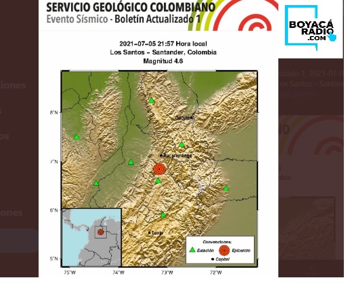 #SismosColombiaSGC Evento Sísmico - Boletín Actualizado 1, 2021-07-05, 21:57 hora local Magnitud 4.6, Profundidad 153 km, Los Santos - Santander, Colombia ¿Sintió este sismo? repórtelo https://t.co/ehDqPbETsf https://t.co/63pt8nVsSe #NoticiaEnDesarrollo #Temblor pic.twitter.com/JVzLCBdbIS
