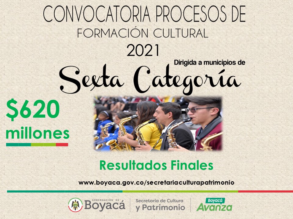 Con la presente convocatoria, el departamento, a través de la Secretaría de Cultura y Patrimonio de Boyacá, da cumplimiento a los principios constitucionales de participación, democracia, transparencia e inclusión y, en consecuencia, apoya financieramente a los municipios de sexta categoría que han sido seleccionados para que desarrollen proyectos culturales de interés público que contribuyan a fortalecer los procesos de formación artística de su territorio y a consolidar el Sistema Departamental de Cultura.