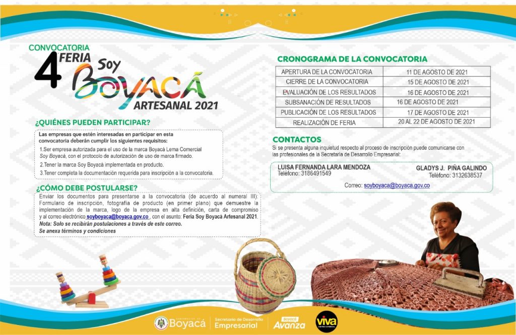 Para promocionar y posicionar los productos embajadores y empresas vinculadas a la estrategia de marketing territorial del departamento, mediante la participación en un espacio de relacionamiento estratégico en el Centro Comercial Viva Tunja, que en su labor comercial se ha convertido en un aliado indispensable para la sectorial, permitiendo el uso de sus instalaciones para la realización de ferias y espacios de visibilidad fomentan el desarrollo y la competitividad empresarial de nuestros artesanos y emprendedores boyacenses, la Secretaría de Desarrollo Empresarial abrió la Convocatoria No. 4 “Feria Soy Boyacá Artesanal 2021” de la Marca Región Soy Boyacá.