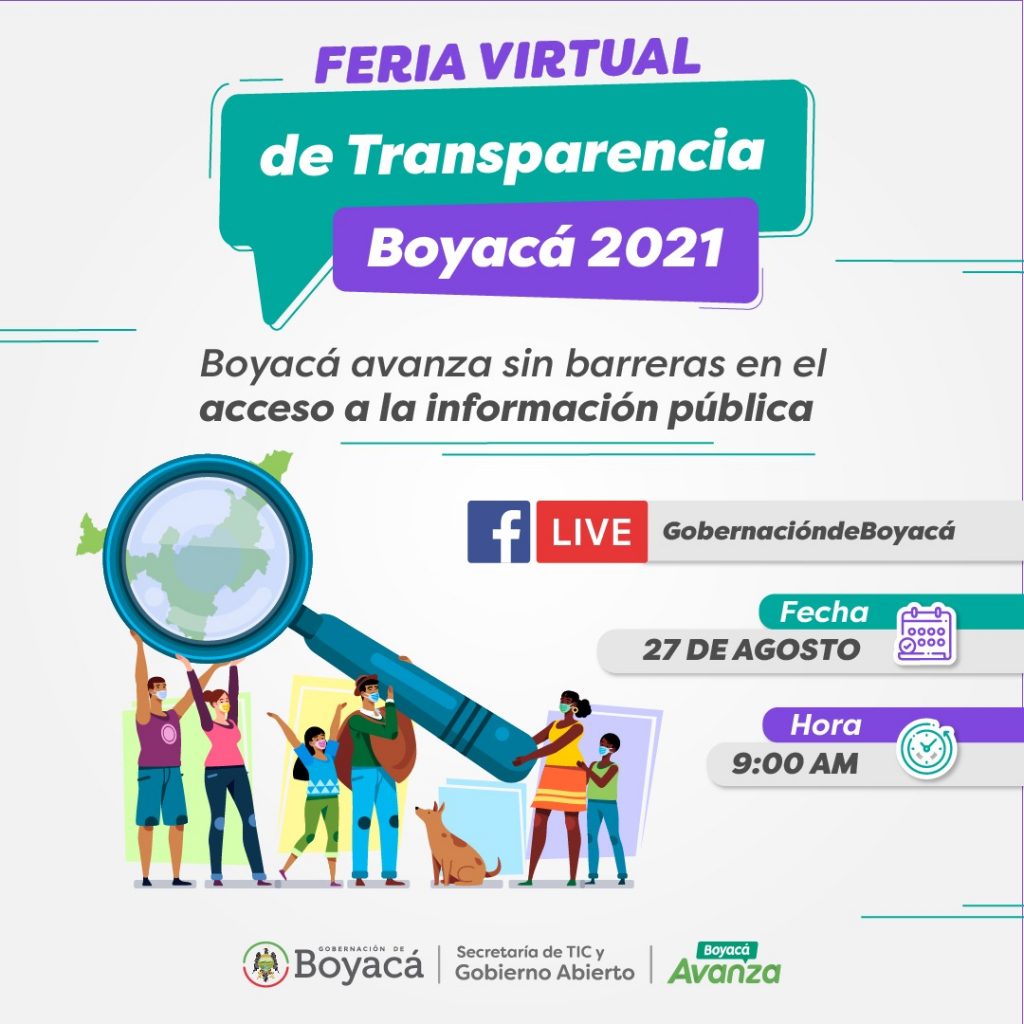 Llegó la quinta edición de la Feria de Transparencia de la Gobernación de Boyacá. La actividad se realizará este viernes 27 de agosto, a las 9:00 de la mañana, a través de un Live en la página de Facebook de la Gobernación de Boyacá.