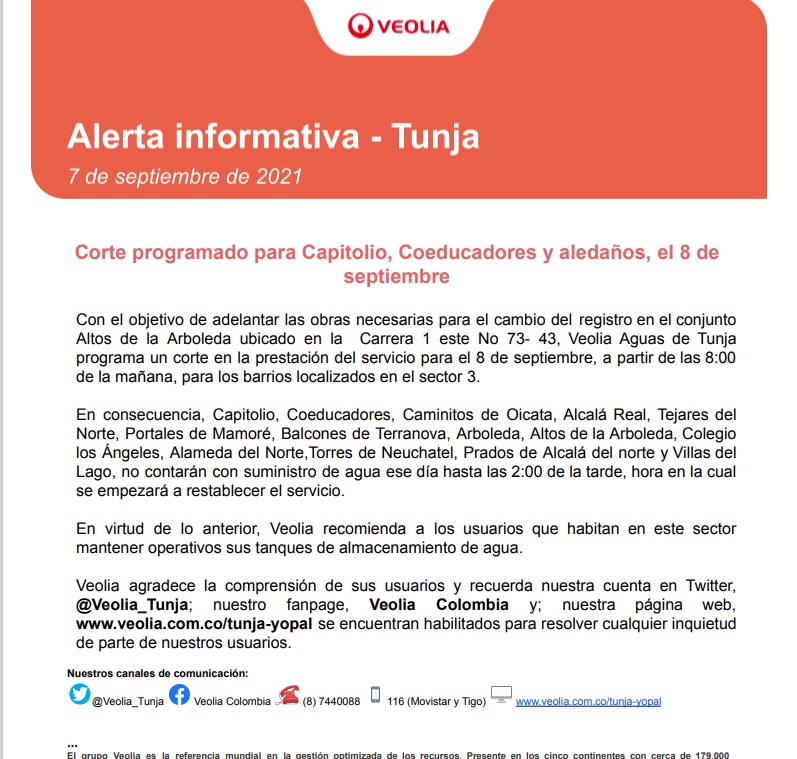 Con el objetivo de adelantar las obras necesarias para el cambio del registro en el conjunto Altos de la Arboleda ubicado en la Carrera 1 este No 73- 43, Veolia Aguas de Tunja programa un corte en la prestación del servicio para el 8 de septiembre, a partir de las 8:00 de la mañana, para los barrios localizados en el sector 3.